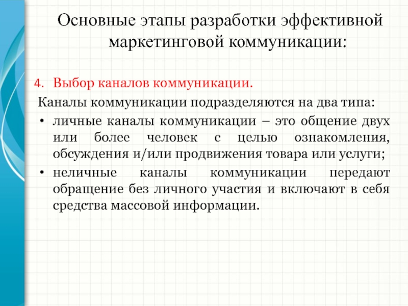 Основные этапы разработки эффективной маркетинговой коммуникации: Выбор каналов коммуникации.Каналы коммуникации подразделяются на два типа:личные каналы коммуникации –