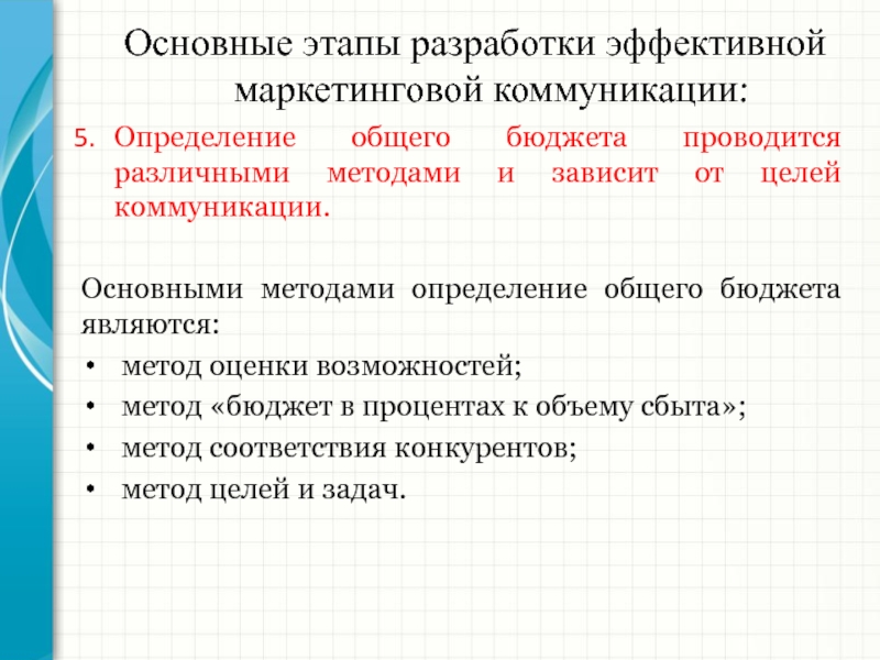 Основные этапы разработки эффективной маркетинговой коммуникации: Определение общего бюджета проводится различными методами и зависит от целей коммуникации.Основными