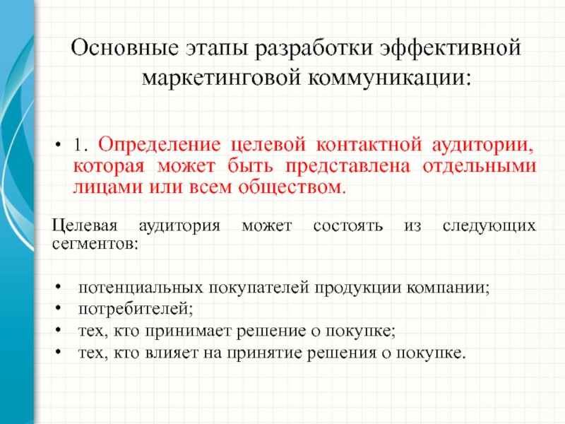 Основные этапы разработки эффективной маркетинговой коммуникации: 1. Определение целевой контактной аудитории, которая может быть представлена отдельными лицами