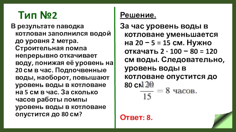 на 20 см в час. Подпочвенные воды, наоборот, повышают уровень воды в котловане на 5 см в час. За сколько часов работы помпы уровень воды в котловане опустится до 80 см?