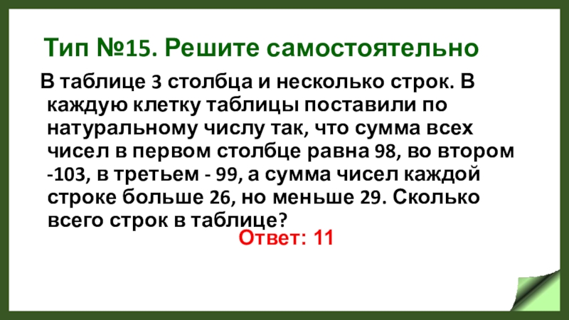 так, что сумма всех чисел в первом столбце равна 98, во втором -103, в третьем - 99, а сумма чисел каждой строке больше 26, но меньше 29. Сколько всего строк в таблице?