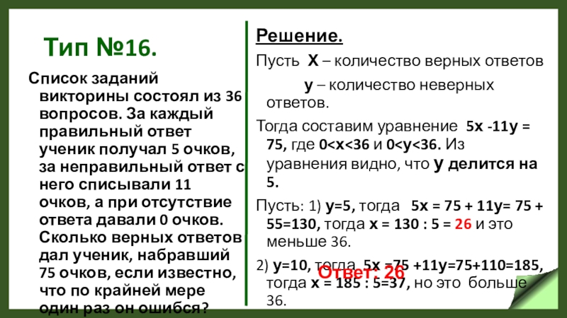 неправильный ответ с него снимали 9 очков, при отсутствии ответа давали 0 очков. Сколько верных ответов дал ученик, набравший 75 очков, если известно, что он по крайней мере 2 раза ошибся? Ответ: 24