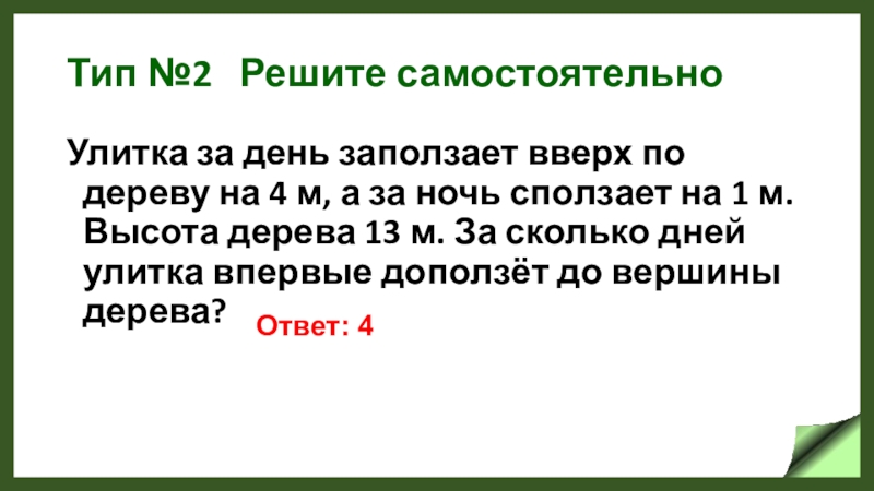 м. Высота дерева 13 м. За сколько дней улитка впервые доползёт до вершины дерева?