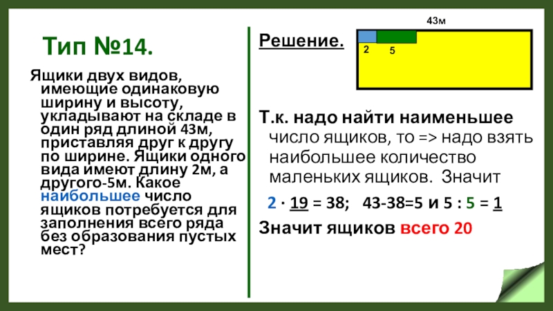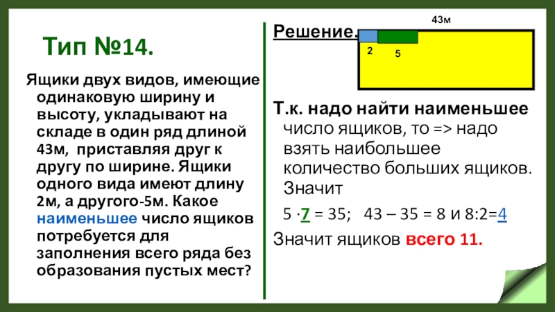 другу по ширине. Ящики одного вида имеют длину 2м, а другого-5м. Какое наибольшее число ящиков потребуется для заполнения всего ряда без образования пустых мест?