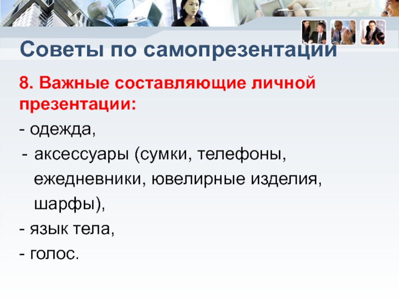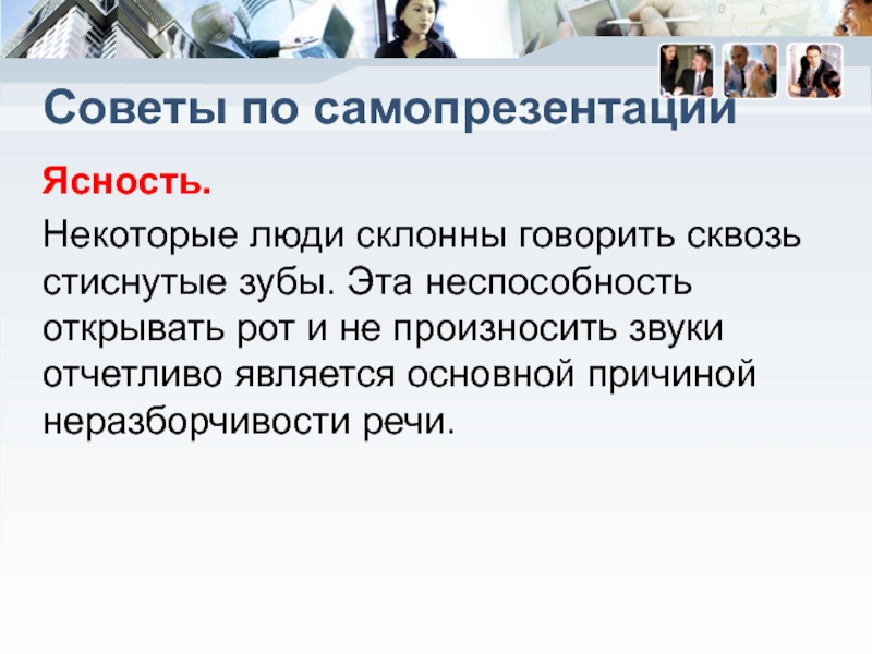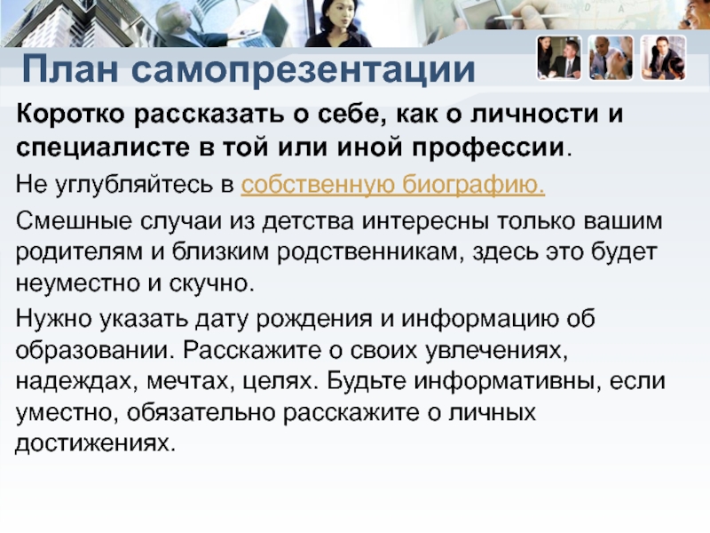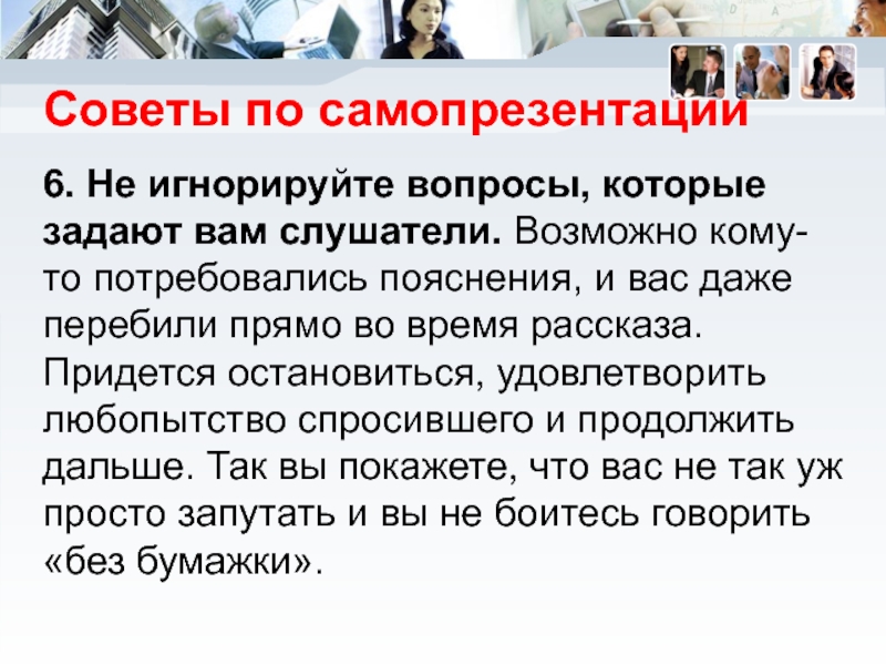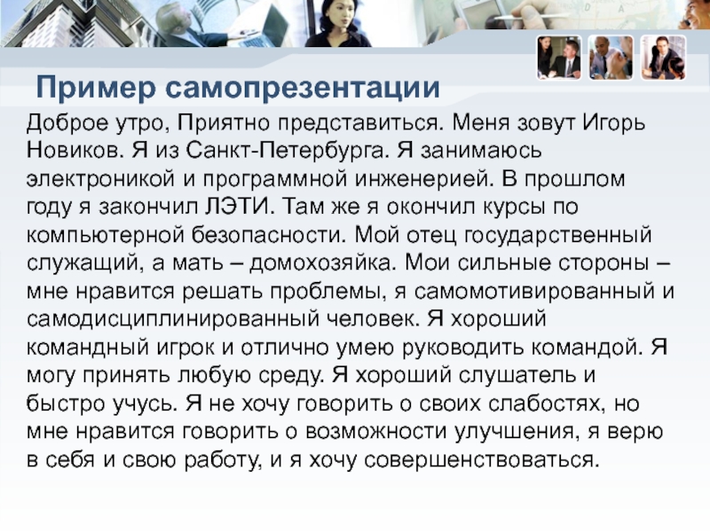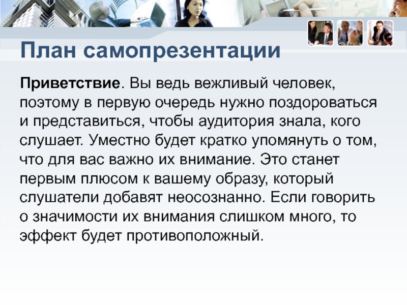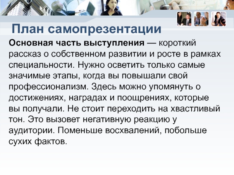 вам показалось, что завоевать доверие слушателей не получилось, нужно сохранить лицо до тех пор, пока вы не покинете место собственной презентации. Это может стать плюсом к вашим достоинством в глазах аудитории. Во время самопрезентации вы должны виртуозно совместить демонстрацию собственных «сильных» сторон с процессом расположения аудитории к себе.