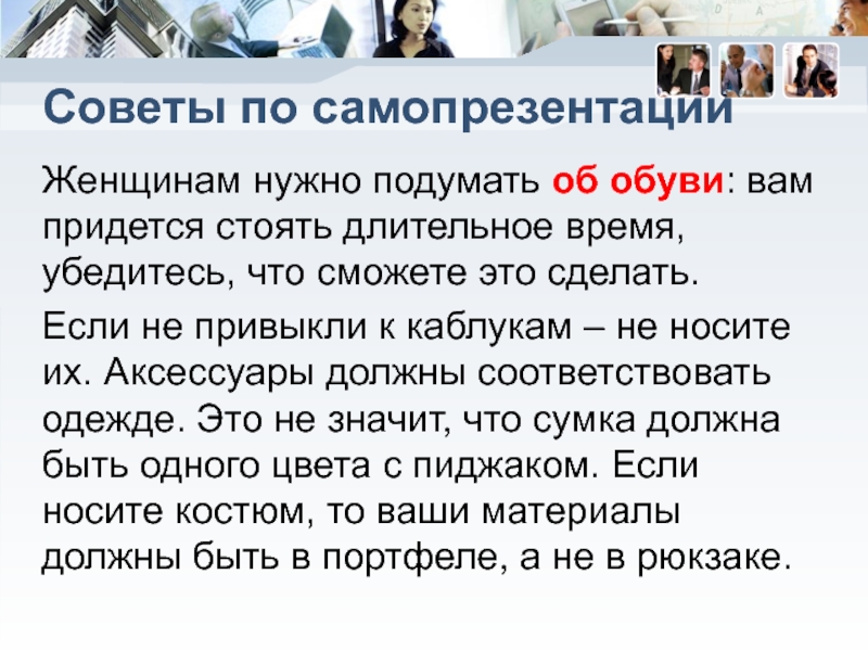 к каблукам – не носите их. Аксессуары должны соответствовать одежде. Это не значит, что сумка должна быть одного цвета с пиджаком. Если носите костюм, то ваши материалы должны быть в портфеле, а не в рюкзаке.