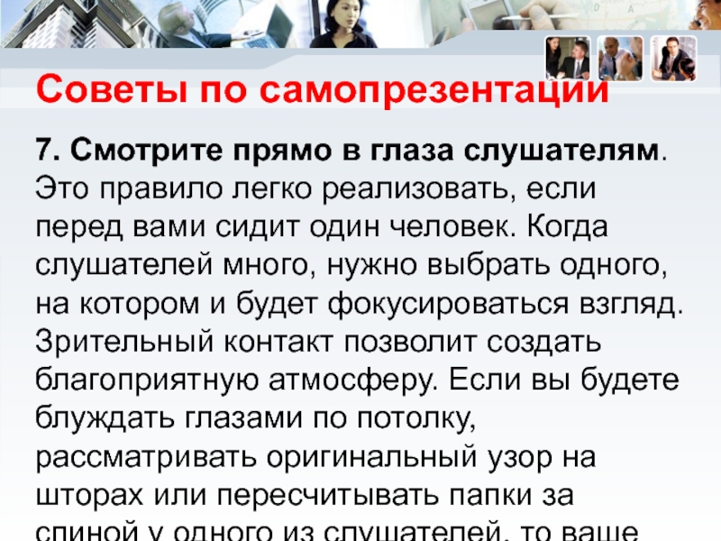 много, нужно выбрать одного, на котором и будет фокусироваться взгляд. Зрительный контакт позволит создать благоприятную атмосферу. Если вы будете блуждать глазами по потолку, рассматривать оригинальный узор на шторах или пересчитывать папки за спиной у одного из слушателей, то ваше выступление не произведет желаемого эффекта. Вы ведь не цитируете стихотворение на уроке литературы. Когда человек не может сконцентрировать взгляд на аудитории, то создается впечатление, словно он говорит заученные вещи и его очень легко отвлечь от монолога.