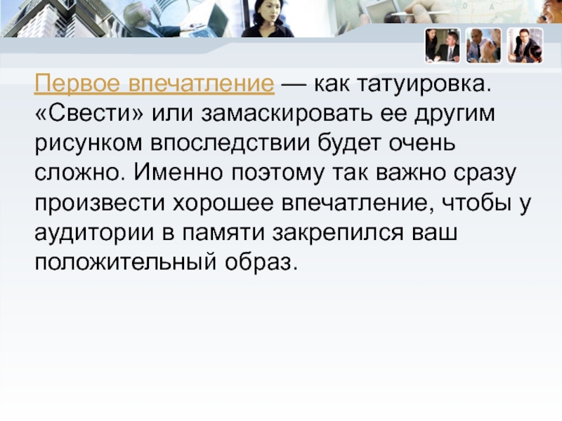 Слайд 34Первое впечатление — как татуировка. «Свести» или замаскировать ее другим рисунком