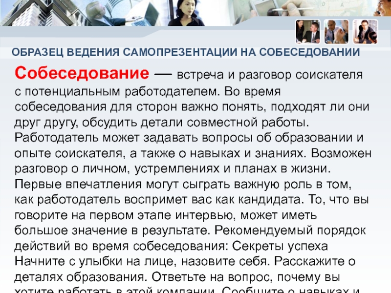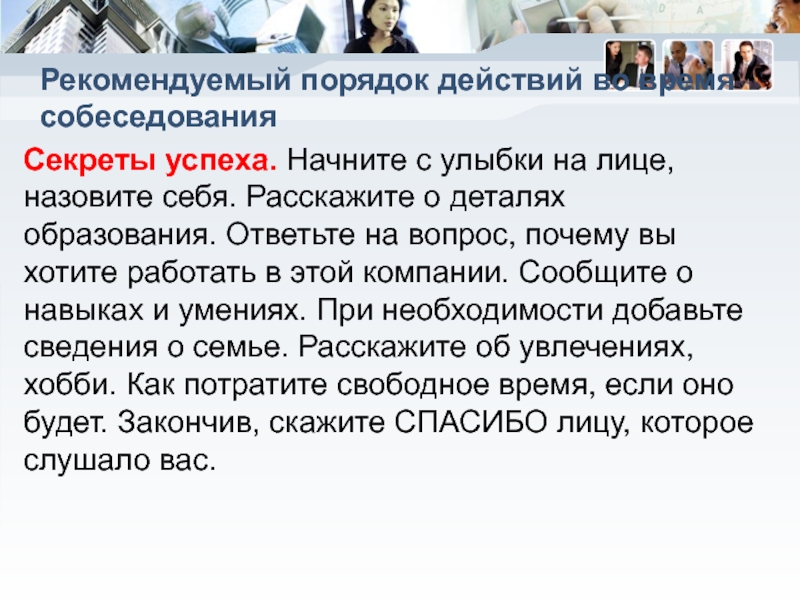 подходят ли они друг другу, обсудить детали совместной работы. Работодатель может задавать вопросы об образовании и опыте соискателя, а также о навыках и знаниях. Возможен разговор о личном, устремлениях и планах в жизни. Первые впечатления могут сыграть важную роль в том, как работодатель воспримет вас как кандидата. То, что вы говорите на первом этапе интервью, может иметь большое значение в результате. Рекомендуемый порядок действий во время собеседования: Секреты успеха Начните с улыбки на лице, назовите себя. Расскажите о деталях образования. Ответьте на вопрос, почему вы хотите работать в этой компании. Сообщите о навыках и умениях. При необходимости добавьте сведения о семье. Расскажите об увлечениях, хобби. Как потратите свободное время, если оно будет. Закончив, скажите СПАСИБО лицу, которое слушало вас