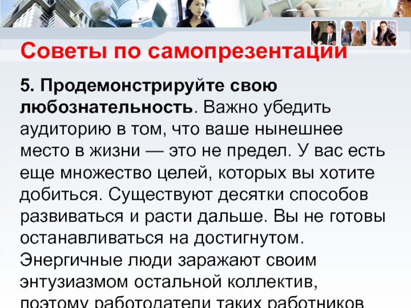 предел. У вас есть еще множество целей, которых вы хотите добиться. Существуют десятки способов развиваться и расти дальше. Вы не готовы останавливаться на достигнутом. Энергичные люди заражают своим энтузиазмом остальной коллектив, поэтому работодатели таких работников ценят высоко.