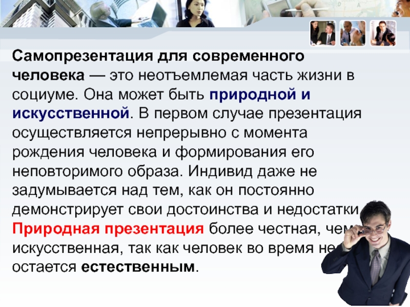 презентация осуществляется непрерывно с момента рождения человека и формирования его неповторимого образа. Индивид даже не задумывается над тем, как он постоянно демонстрирует свои достоинства и недостатки. Природная презентация более честная, чем искусственная, так как человек во время нее остается естественным.