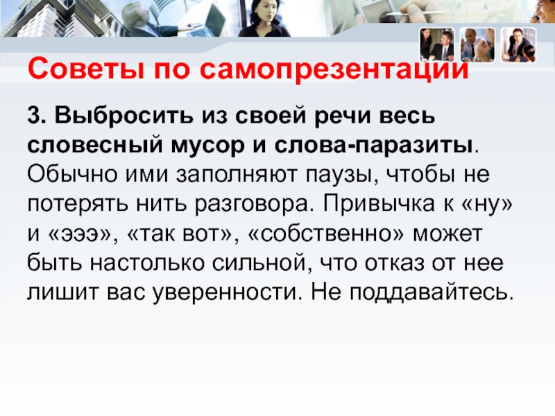 разговора. Привычка к «ну» и «эээ», «так вот», «собственно» может быть настолько сильной, что отказ от нее лишит вас уверенности. Не поддавайтесь.