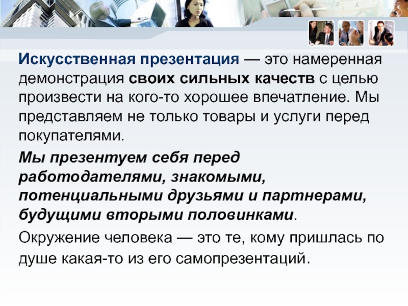 Слайд 4Искусственная презентация — это намеренная демонстрация своих сильных качеств с