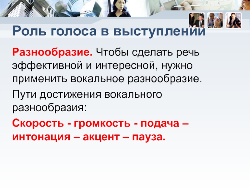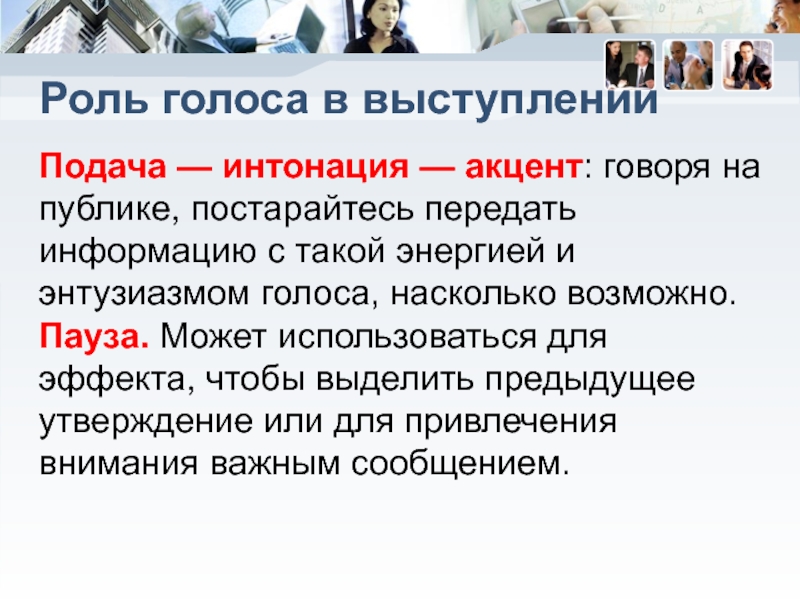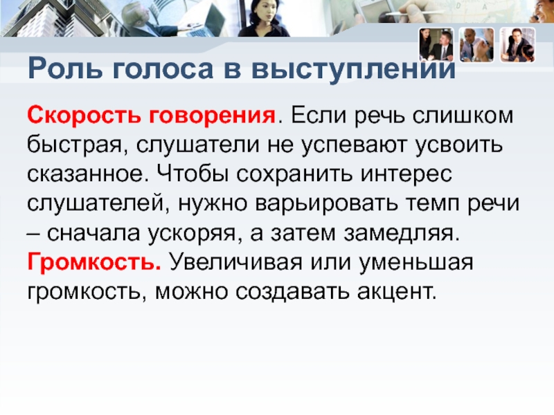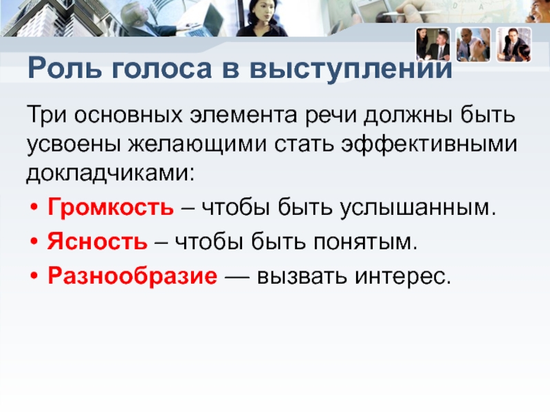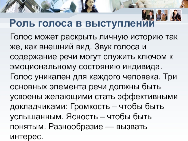 ключом к эмоциональному состоянию индивида. Голос уникален для каждого человека. Три основных элемента речи должны быть усвоены желающими стать эффективными докладчиками: Громкость – чтобы быть услышанным. Ясность – чтобы быть понятым. Разнообразие — вызвать интерес.
