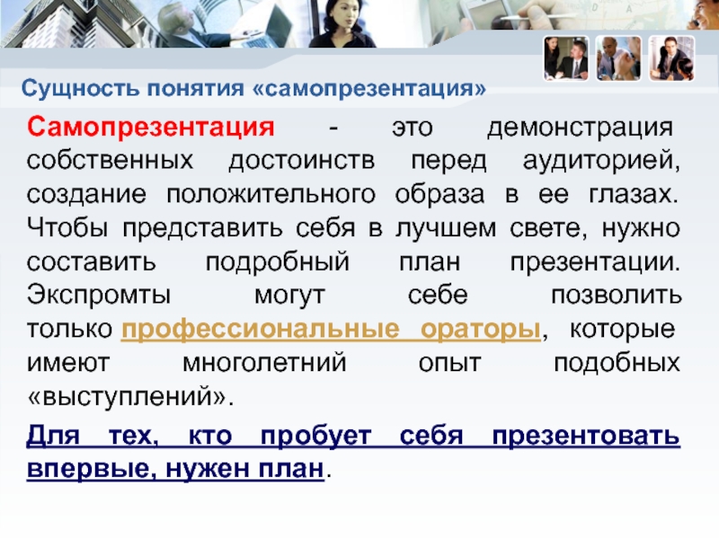 Самопрезентация - это демонстрация собственных достоинств перед аудиторией,