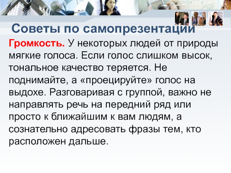 «проецируйте» голос на выдохе. Разговаривая с группой, важно не направлять речь на передний ряд или просто к ближайшим к вам людям, а сознательно адресовать фразы тем, кто расположен дальше.