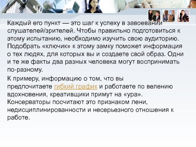 К примеру, информацию о том, что вы предпочитаете гибкий график и работаете по велению вдохновения, креативщики примут на «ура». Консерваторы посчитают это признаком лени, недисциплинированности и несерьезного отношения к работе.