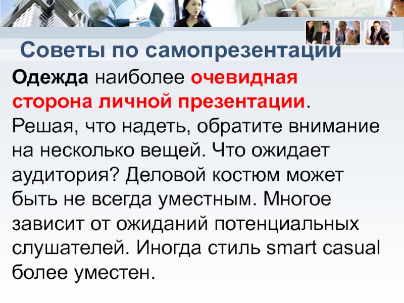 Одежда наиболее очевидная сторона личной презентации. Решая, что