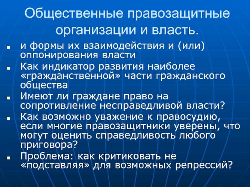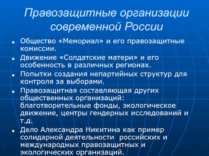Правозащитная составляющая других общественных организаций: благотворительные фонды, экологическое движение, центры гендерных исследований и т.д.