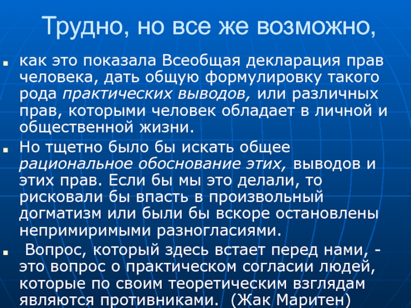 тому, что известные сторонники жестко противоборствующих идеологий пришли к согласию по поводу проекта перечня этих прав. Да, отвечали они, мы согласились по поводу этих прав, полагая, что нас не спросят почему. С этого "почему" начинается полемика.»