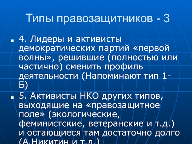 5. Активисты НКО других типов, выходящие на «правозащитное поле» (экологические, феминистские, ветеранские и т.д.) и остающиеся там достаточно долго (А.Никитин и т.д.)