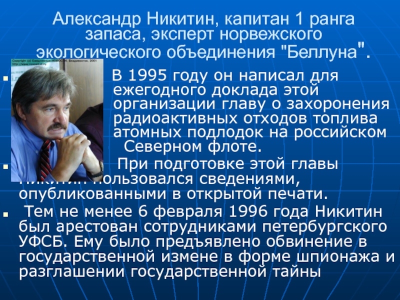 Слайд 62Александр Никитин, капитан 1 ранга запаса, эксперт норвежского экологического объединения