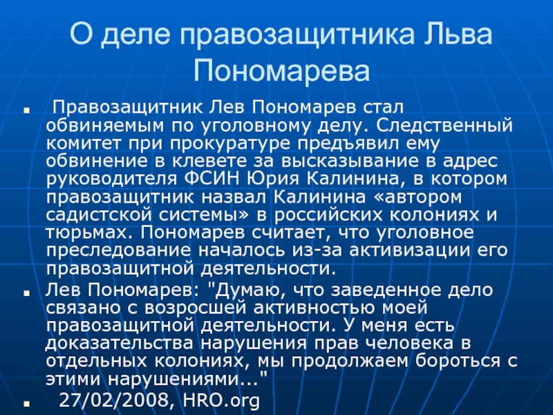 обвинение в клевете за высказывание в адрес руководителя ФСИН Юрия Калинина, в котором правозащитник назвал Калинина «автором садистской системы» в российских колониях и тюрьмах. Пономарев считает, что уголовное преследование началось из-за активизации его правозащитной деятельности.