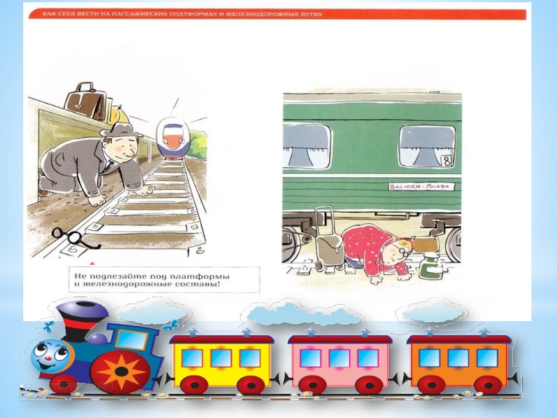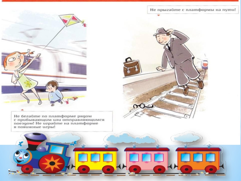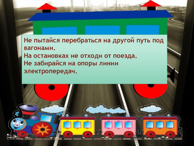 Не пытайся перебраться на другой путь под вагонами.На остановках не отходи от поезда.Не забирайся на опоры линииэлектропередач.