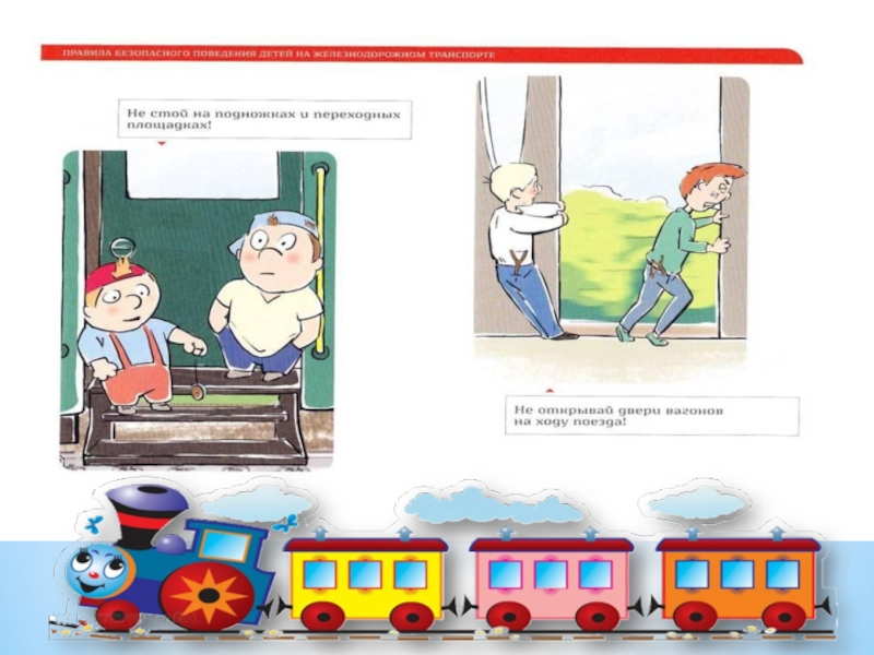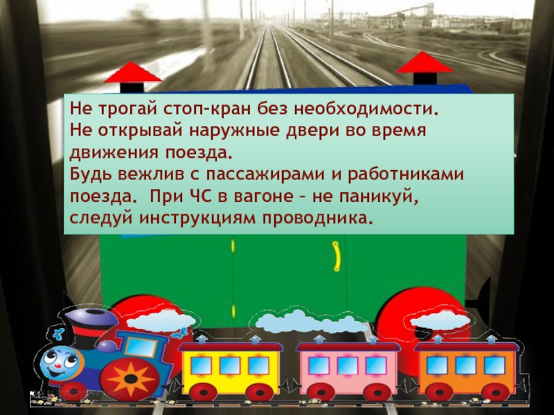 Не трогай стоп-кран без необходимости.Не открывай наружные двери во время движения поезда.Будь вежлив с пассажирами и работникамипоезда.