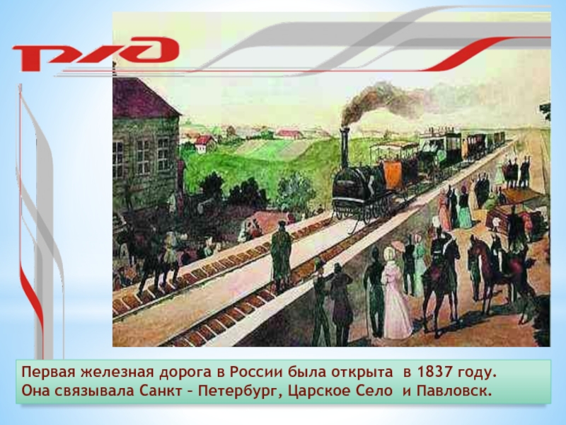 Первая железная дорога в России была открыта в 1837 году.Она связывала Санкт – Петербург, Царское Село и