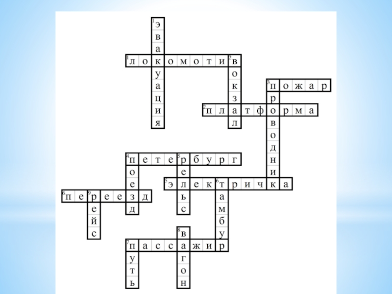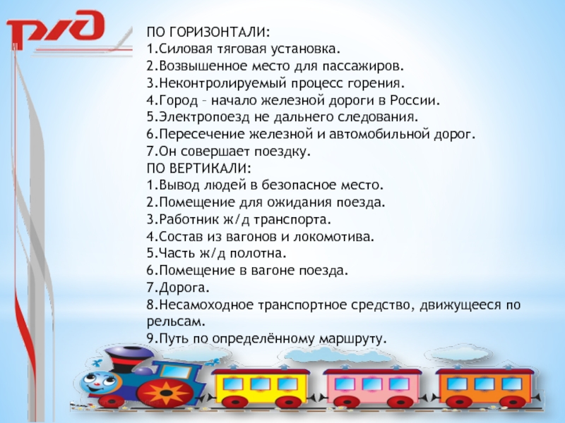 ПО ГОРИЗОНТАЛИ:1.Силовая тяговая установка.2.Возвышенное место для пассажиров.3.Неконтролируемый процесс горения.4.Город – начало железной дороги в России.5.Электропоезд не дальнего