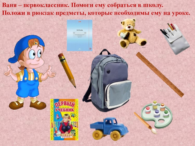 Слайд 14Ваня – первоклассник. Помоги ему собраться в школу.
