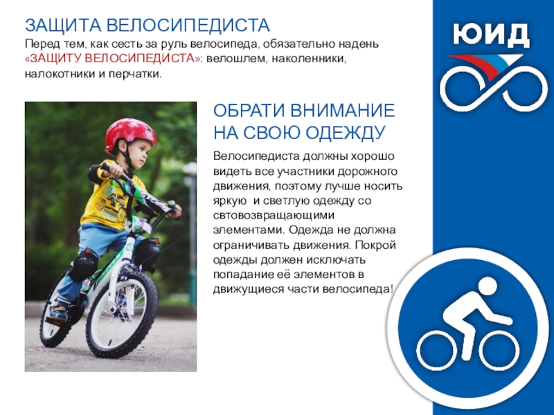 Велосипедиста должны хорошо видеть все участники дорожного движения, поэтому лучше носить яркую и светлую одежду со свтовозвращающими элементами. Одежда не должна ограничивать движения. Покрой одежды должен исключать попадание её элементов в движущиеся части велосипеда!