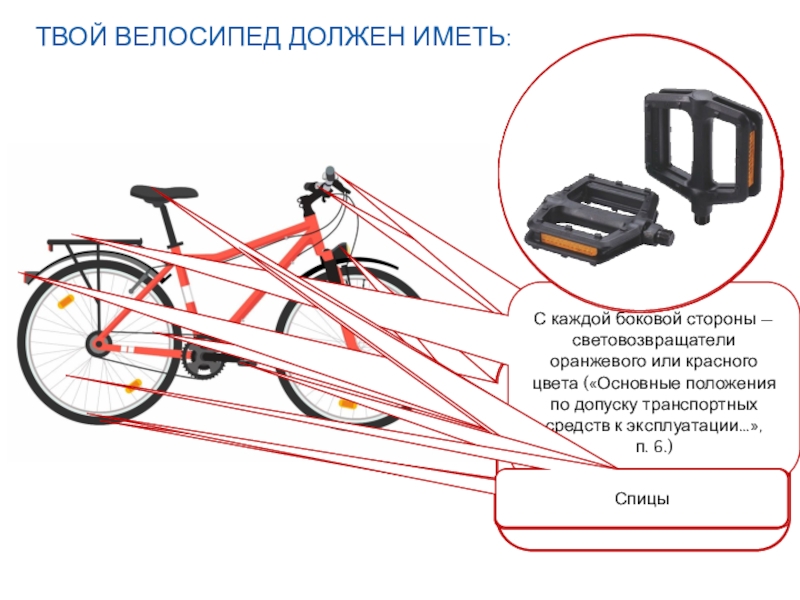 Сзади световозвращатель или фонарь красного цвета (правила дорожного движения п.2.3.1 и «Основные положения по допуску транспортных средств к эксплуатации…», п. 6.)
