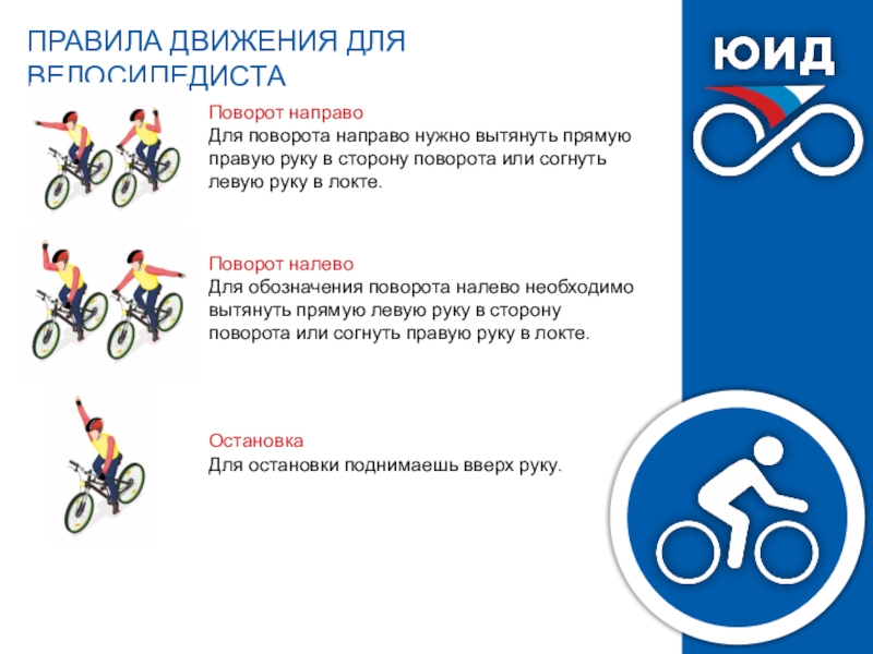Для поворота направо нужно вытянуть прямую правую руку в сторону поворота или согнуть левую руку в локте.