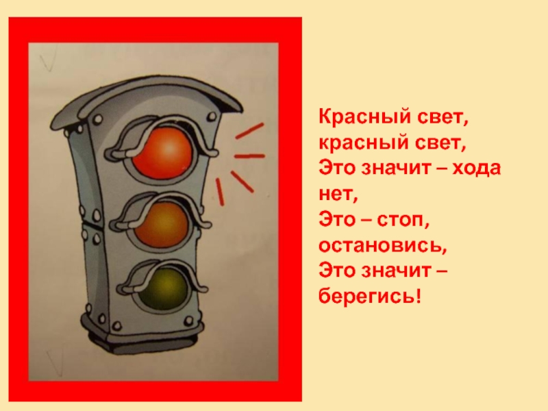 Красный свет, красный свет, Это значит – хода нет, Это – стоп, остановись, Это значит – берегись!