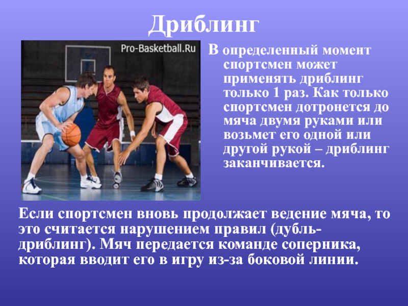 В определенный момент спортсмен может применять дриблинг только 1 раз.