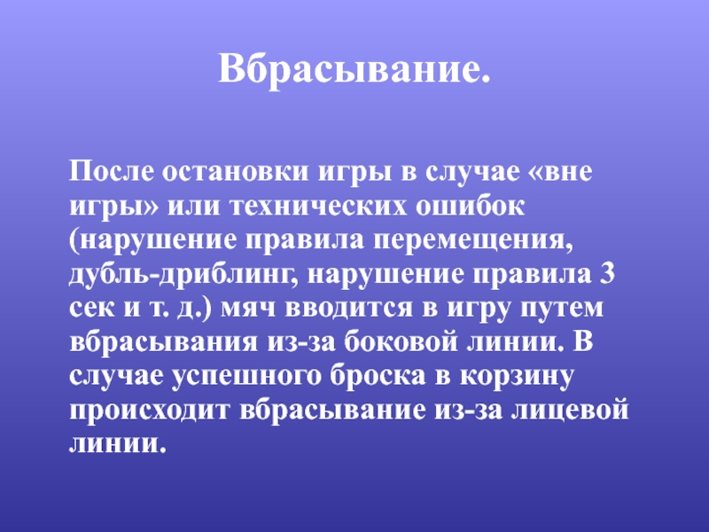 и т. д.) мяч вводится в игру путем вбрасывания из-за боковой линии. В случае успешного броска в корзину происходит вбрасывание из-за лицевой линии.