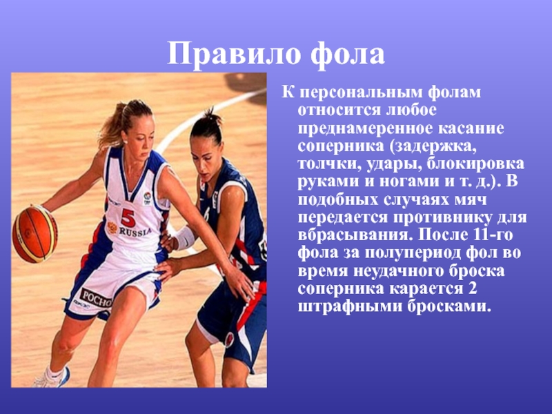 (правило 30 сек). Правило 3 сек гласит, что нападающий не может находиться в области штрафного броска соперника более 3 сек. Для вбрасывания и для осуществления свободного броска игроку отводится 5 сек. При нарушении правил времени мяч отдается сопернику для вбрасывания.