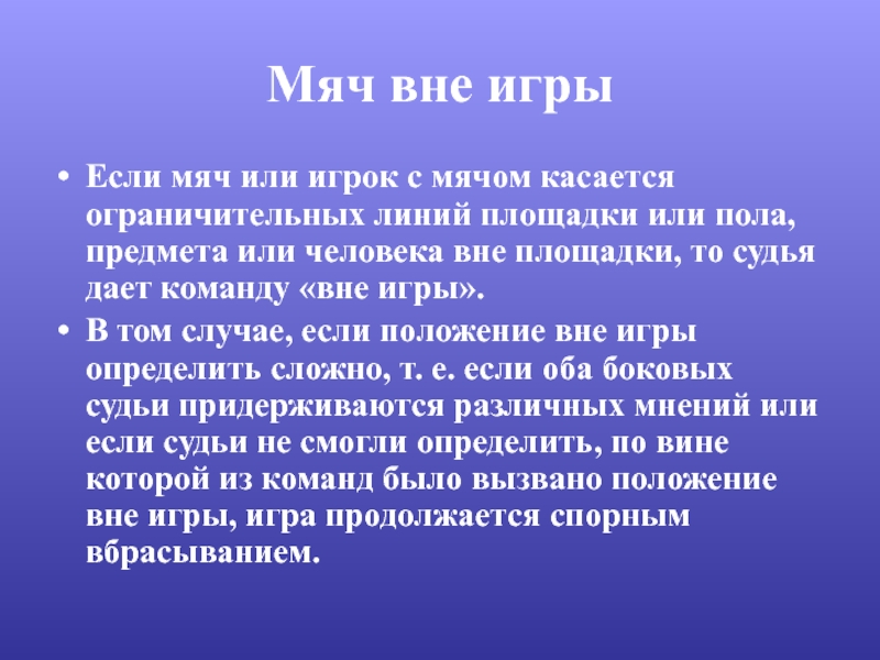 команды и мяч выводится из игры. В этом случае игра продолжается спорным вбрасыванием