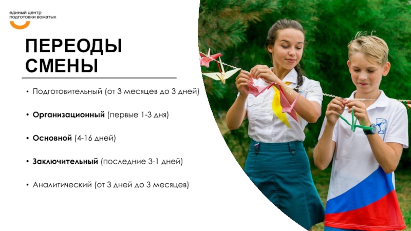 ПЕРЕОДЫ СМЕНЫ Подготовительный (от 3 месяцев до 3 дней)Организационный (первые 1-3 дня)Основной (4-16 дней)Заключительный (последние 3-1 дней)Аналитический