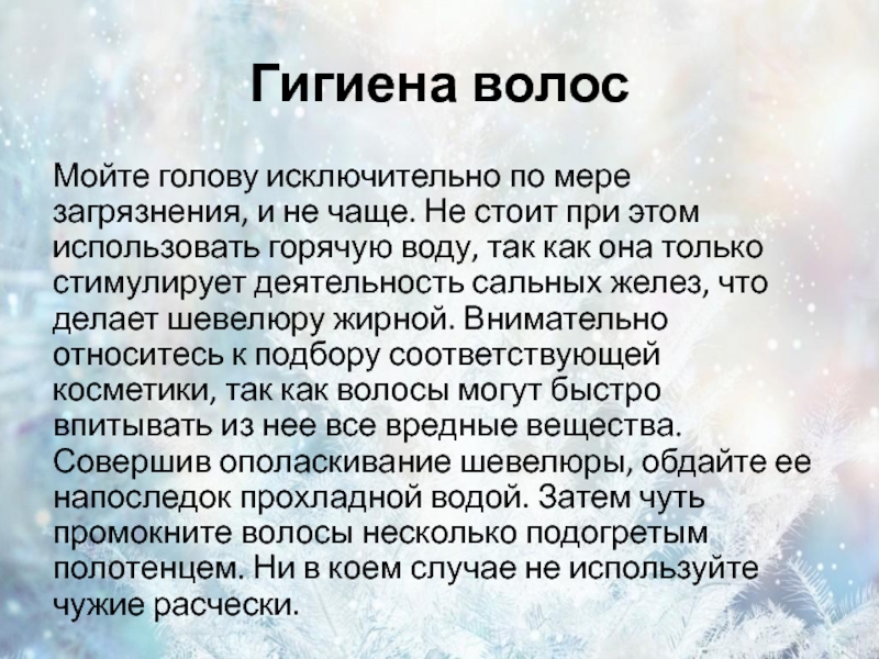 Гигиена волосМойте голову исключительно по мере загрязнения, и не чаще. Не стоит при этом использовать горячую воду,
