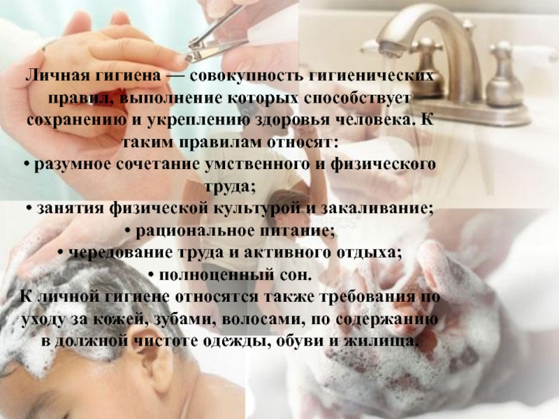 Личная гигиена — совокупность гигиенических правил, выполнение которых способствует сохранению и укреплению здоровья человека. К таким правилам относят: • разумное сочетание умственного и физического труда; • занятия физической культурой и закаливание; • рациональное питание; • чередование