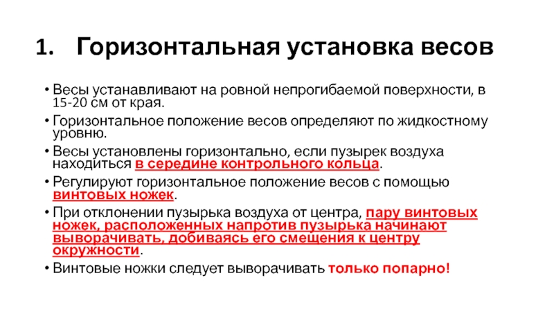Регулируют горизонтальное положение весов с помощью винтовых ножек.
