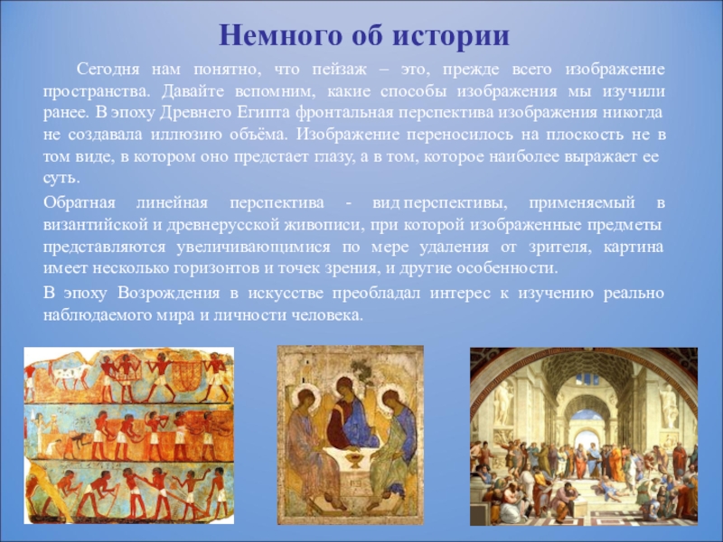 мы изучили ранее. В эпоху Древнего Египта фронтальная перспектива изображения никогда не создавала иллюзию объёма. Изображение переносилось на плоскость не в том виде, в котором оно предстает глазу, а в том, которое наиболее выражает ее суть.