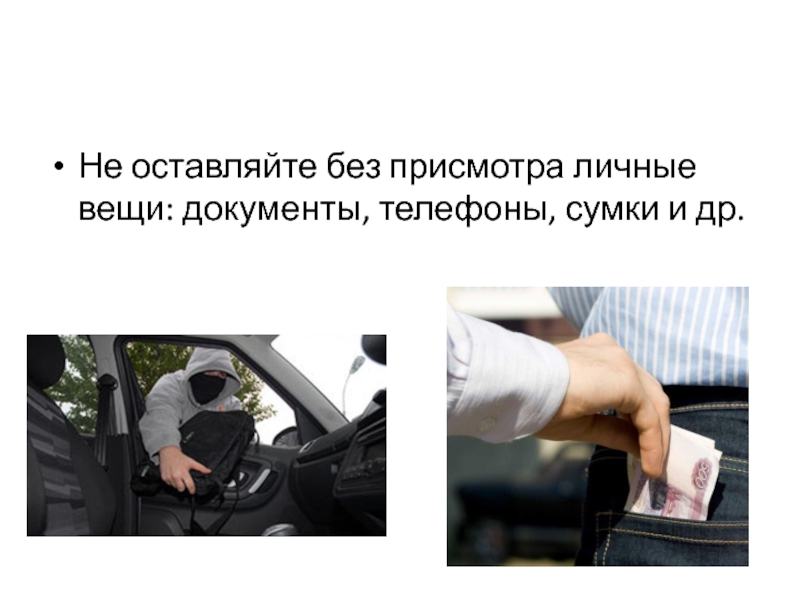 Слайд 15Не оставляйте без присмотра личные вещи: документы, телефоны, сумки и