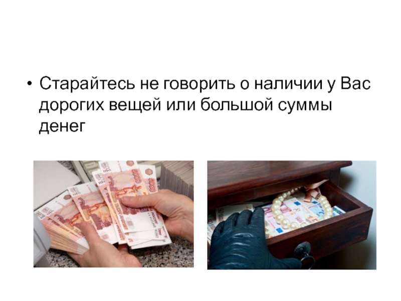 Слайд 5Старайтесь не говорить о наличии у Вас дорогих вещей или