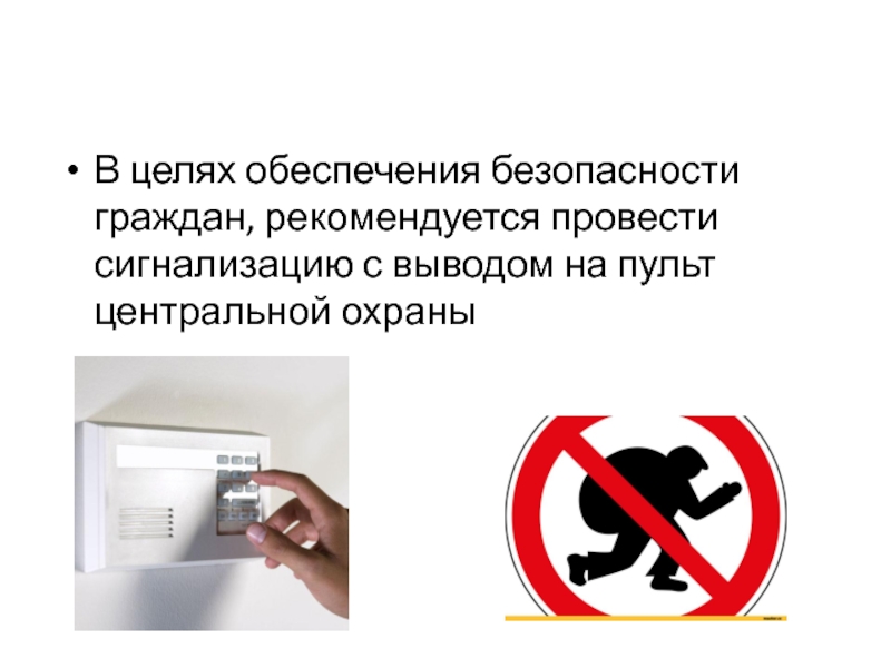 Слайд 16В целях обеспечения безопасности граждан, рекомендуется провести сигнализацию с выводом