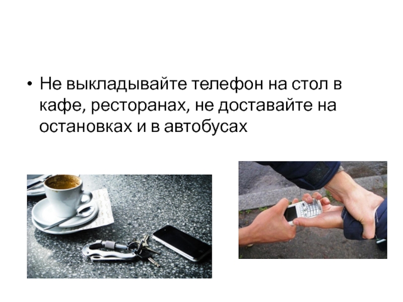 Слайд 8Не выкладывайте телефон на стол в кафе, ресторанах, не доставайте