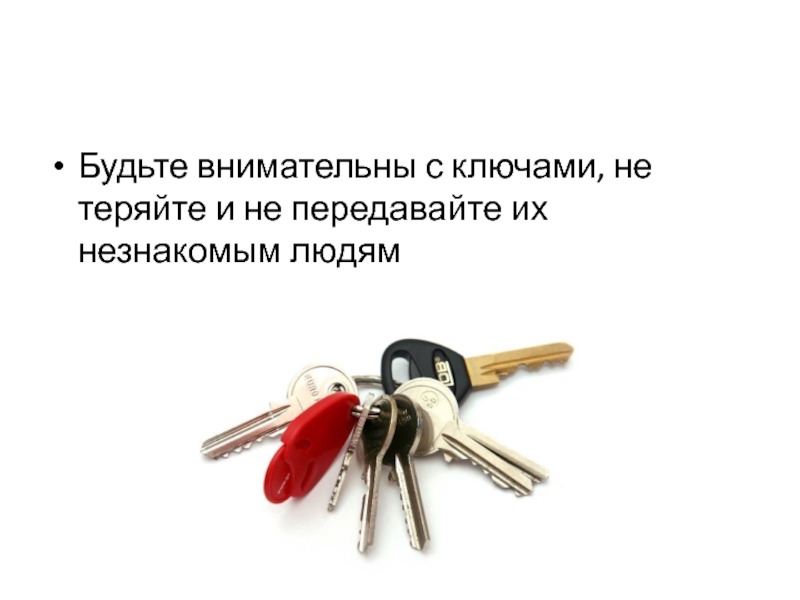 Слайд 14Будьте внимательны с ключами, не теряйте и не передавайте их